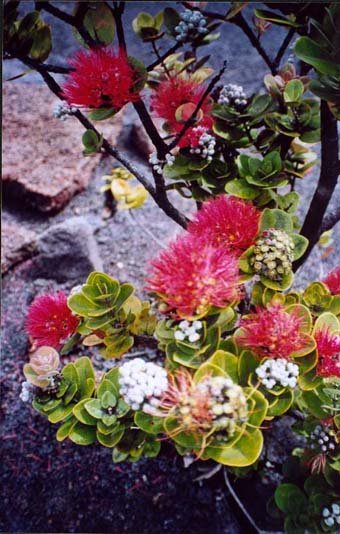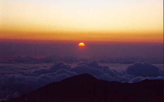 Sonnenaufgang zu erleben. Die Straße windet sich in Serpentinen auf über 3.000 Meter Höhe hinauf, wir erreichen um 4.30 den Gipfel. Eine Menge Leute warten schon hier, die meisten in dicke Decken eingewickelt . Es ist EISKALT!! Um 5.31 endlich! Sonnenaufgang, ein faszinierender Anblick, die Wolken unter uns und zwischen drinnen ein rotes etwas das sich als die gute alte Sonne entpuppt. Nach diesem Erlebnis gehen wir ein Stück am Sliding Sands Trail in den Krater hinein. Es geht uns fast die Luft aus, überall Hinweisschilder, daß man sich möglichst nicht anstrengen soll, wegen der dünnen Luft in dieser Höhe, also gehen wir nicht die vollen 20 km. ;-)) Der Krater des Haleakala ist fast 13km lang und über 4km breit. Seine letzte Eruption hatte der schlafende Riese im Jahre 1790. |